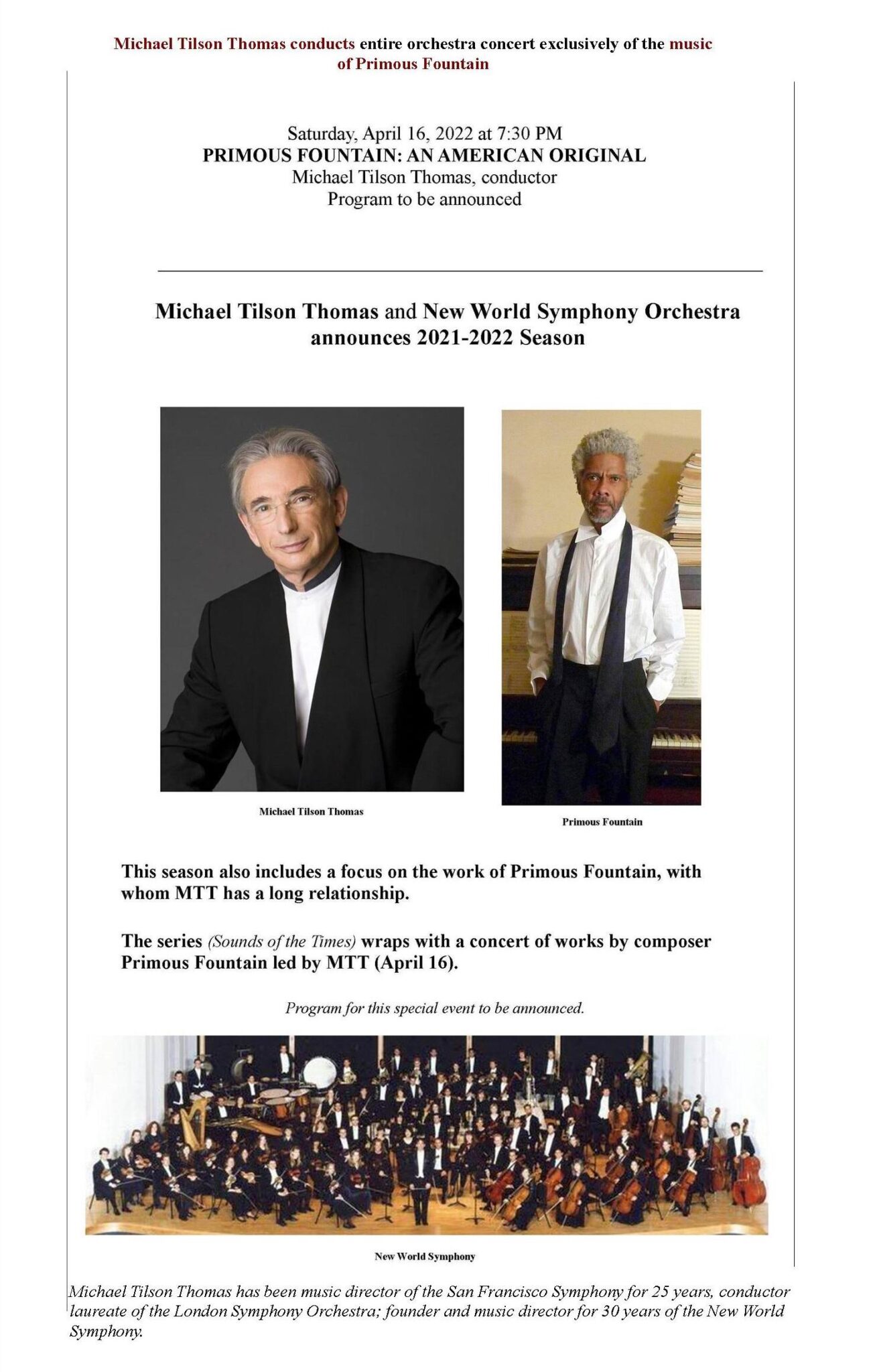 A federal lawsuit has been filed concerning a planned symphony orchestra concert devoted entirely to the works of Primous Fountain, which was publicly announced and later not performed.